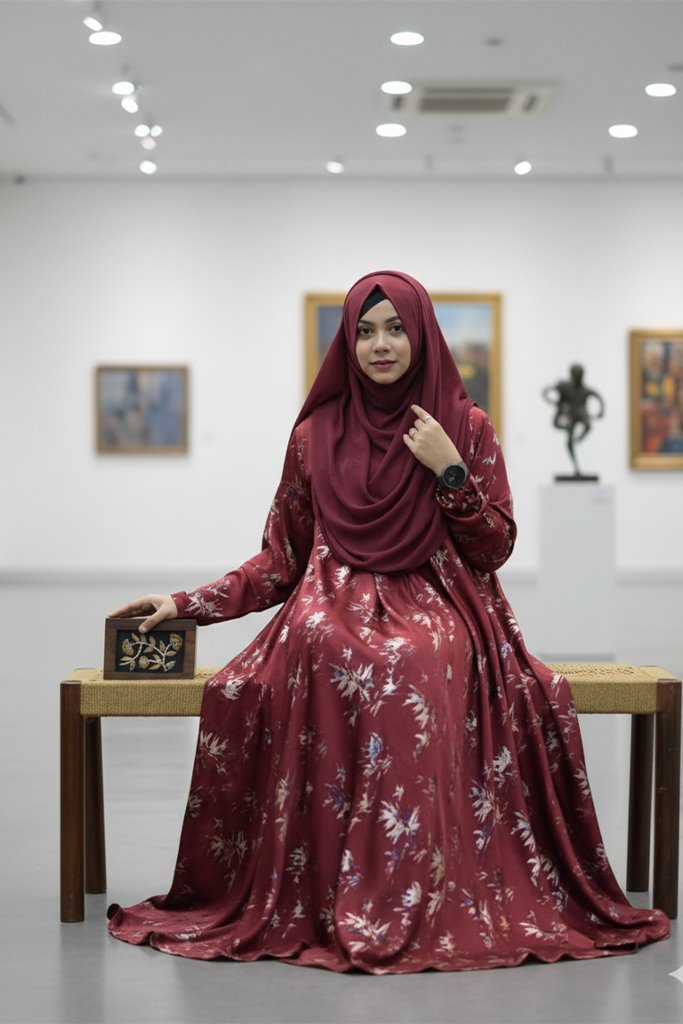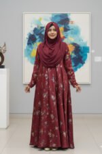 Elegant maroon floral abaya borka made with soft, flowy fabric. Perfect for parties, festive occasions, and everyday modest wear.